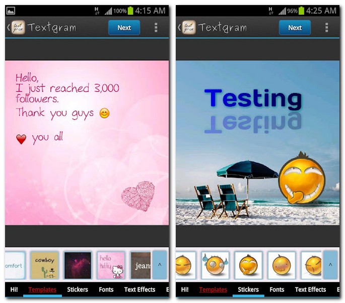 Wer ein wenig kreativere Nachrichten an Freunde und Verwandte schicken möchte, sollte sich einmal Textgram etwas genauer ansehen. Mit der App ist es ein Kinderspiel, schön gestaltete Texte und Mitteilungen an seine Freunde zu versenden. Im Endeffekt muss man nur den Text eintippen und danach formatieren. Der Text kann beispielsweise in Ausrichtung und Größe verändert und mit einer Vielzahl an Smileys aufgepeppt werden. Im nächsten Schritt stehen noch einige Designs zu Auswahl, wodurch sich der Texthintergrund sowie Schriftform und –farbe anpassen lassen. Der fertig gestaltete Text kann dann abschließend auf sozialen Netzwerken geteilt oder per Mail, Dropbox, MMS usw. versendet werden. Natürlich ist auch ein einfaches Speichern des Bilds möglich, beispielsweise, um es als Bildschirmhintergrund verwenden zu können oder um es zu drucken.