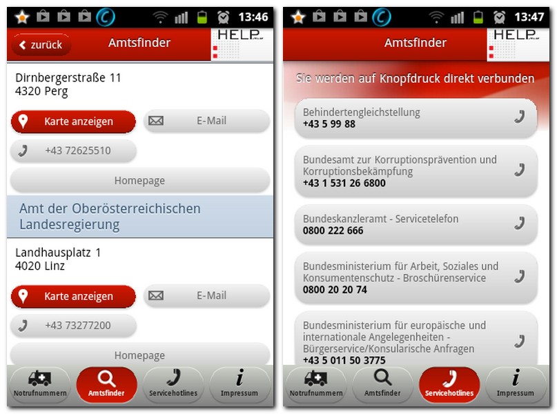 Recht nützlich auch die Notrufnummern von 112 (Euro-Notruf) bis 147 (Notruf für Jugendliche) und eine Auflistung aller bedeutenden Servicehotlines von Behindertengleichstellung bis Vergiftungszentrale. Auf Knopfdruck wirst du direkt verbunden.