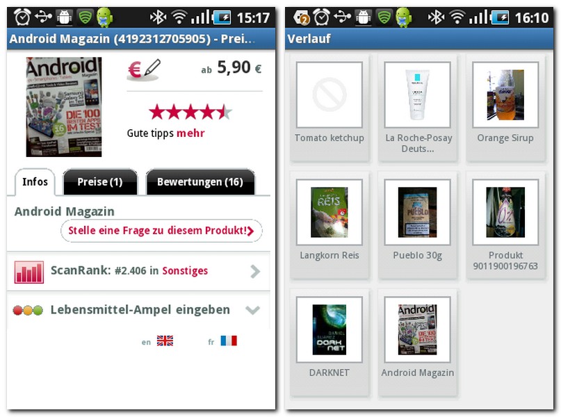 Natürlich müssen Sie nicht auf den Scanner zurückgreifen, Sie können auch den etwas umständlichen Weg über die Eingabe des Produktnamens auf sich nehmen. Oder aber Sie benutzen den integrierten Scan Ticker: Der zeigt ihnen auf Wunsch entweder die zuletzt gescannten oder die häufigst gescannten Artikel an – auf diese Weise sehen sie auch ganz schnell, was den bei anderen Käufern gerade sehr beliebt ist, was auch die Chance einen noch günstigeren Preis zu finden steigert. Darüberhinaus können Sie sich zu Lebensmitteln und Getränken Nährwertlisten und Miniguides anzeigen lassen. Und falls Sie selbst aktiv beitragen wollen, fügen Sie zu einem gescannten Produkt eine Bewertung hinzu oder nutzen die Möglichkeit ihre anderen Konten wie Mail oder Facebook mit barcoo zu verknüpfen.