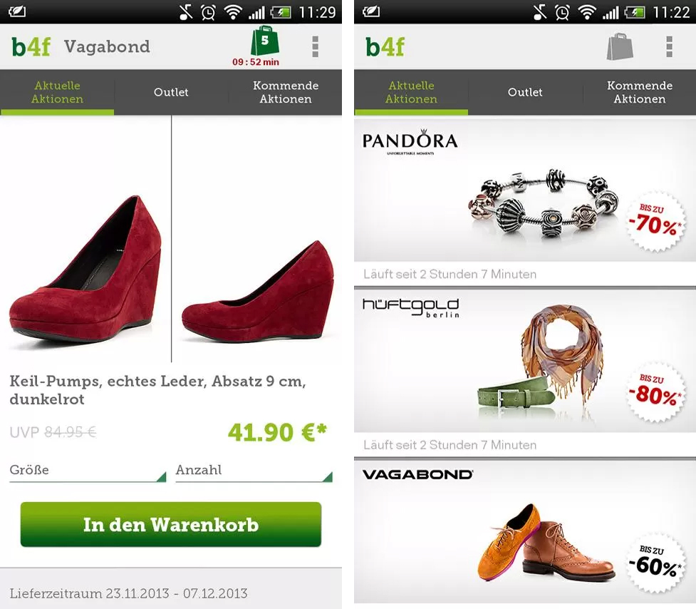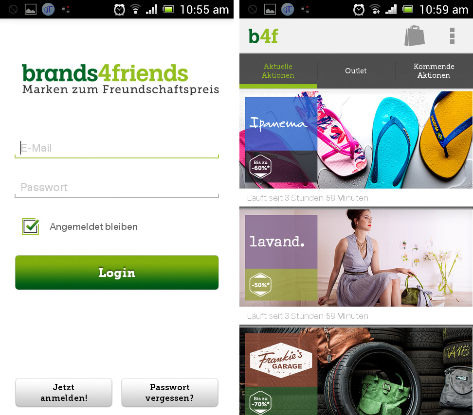 Die App präsentiert die verfügbaren Angebote zwar sehr übersichtlich, der Hersteller bietet aber auch die Möglichkeit sich durch einen E-Mail-Newsletter zweimal pro Tag über die im Store startenden Aktionen zu informieren. Zudem kann die App auf Wunsch auch Notifications in der Statusbar anzeigen – es ist also unwahrscheinlich, dass du dein Traumangebot in brands4friends verpasst.