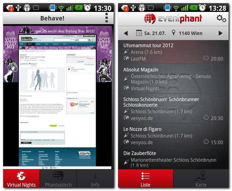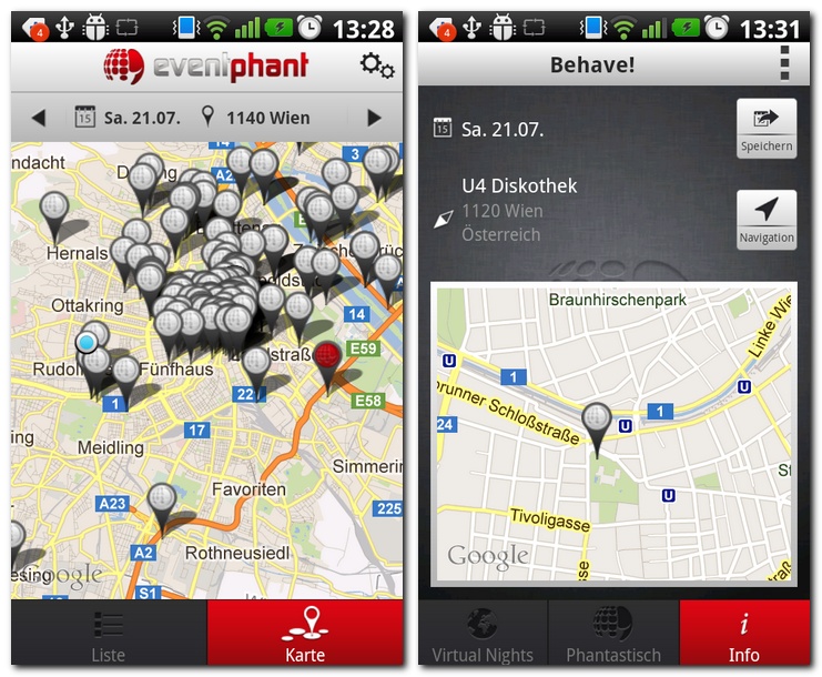 Dabei hat der Anwender die Wahl sich die Events entweder in einer Listenansicht oder aber in einer praktisch ungemein nützlichen Kartenansicht anzeigen zu lassen, wobei auch die Möglichkeit der Direktnavigation zu den einzelnen Events besteht. Auch weiterführende Informationen lassen sich auf diese Weise einholen, darüberhinaus lassen sich die zugehörigen Event-Quellen aber auch direkt aus Eventphant aufrufen.
