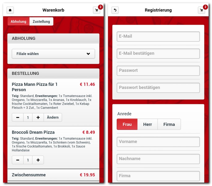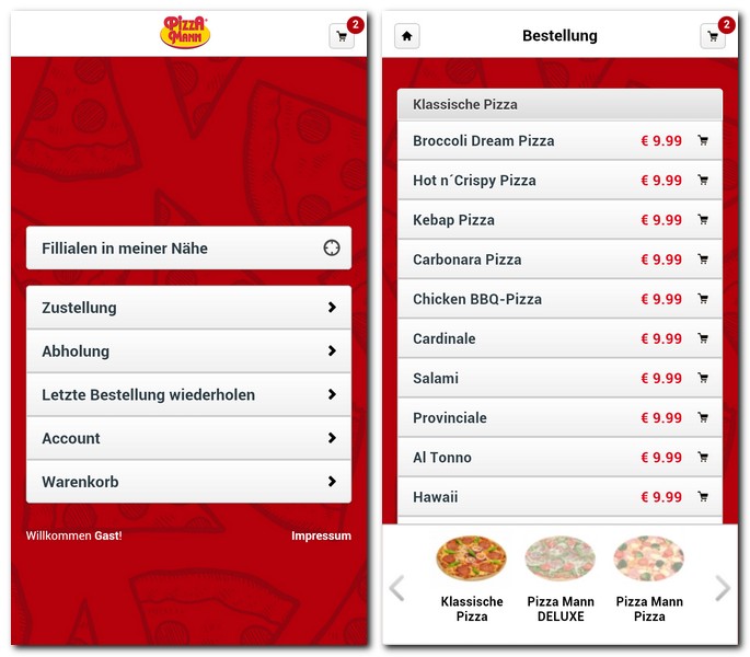 Nach der raschen Installation des kleinen Helferleins kannst du deine klassische Pizza auf zwei Arten beschaffen: Per GPS wird deine Position ermittelt und du bekommst sämtliche Filialen in deiner Nähe angezeigt. Liegt das nächste Pizza Mann-Restaurant also gleich um die Ecke, tippst du auf den Menüpunkt „Abholung“, bestellst, was dein Magen begehrt und machst dich auf den Weg.