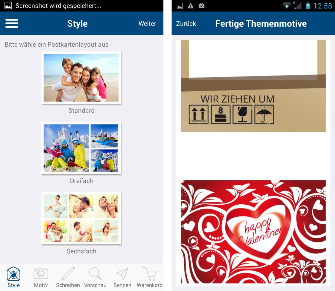 Egal ob die Postkarte hübsch, ausgefallen, schrecklich oder einfach nur schön werden soll, die App bietet eine Vielzahl an Motiven für jeden Anlass. Will man die Grüße individuell gestalten, so kann man natürlich auch seine eigenen Fotos hochladen.