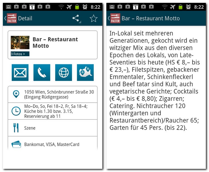 Die Suchergebnisse selbst werden übersichtlich als Liste oder auf der Karte dargestellt. Ein Fingertipp auf einen Eintrag bringt dich zur Detailansicht, die mit Adresse, Öffnungszeiten, Kategorie und besonderen Features wie Bankomat- oder Kreditkarte, WLAN, Gastgarten, Raucher/Nichtraucher aufwartet. Zu einigen Gaststätten findest du auch Fotos vor. So kannst du dir schon vorab ein Bild vom Lokal der Begierde machen.