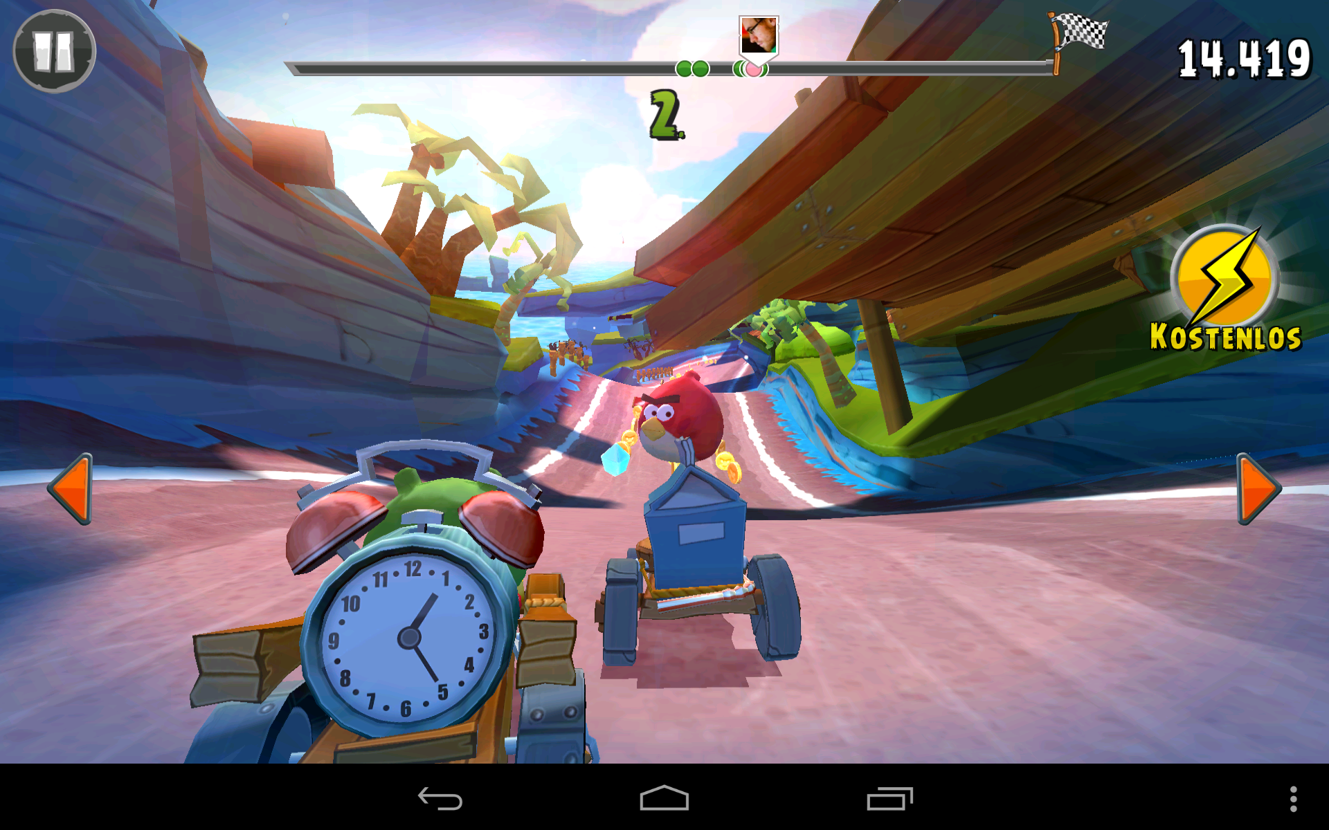 Die technische Umsetzung von Angry Birds Go ist hervorragend: Rovio ist der Sprung von 2D zu 3D gelungen, die Strecken sind farbenfroh und haben mitunter sehr hübsche Lichteffekte zu bieten. Auch die Steuerung überzeugt, wahlweise kannst du den Wagen per Neigungssensor oder virtuellen Tasten am linken beziehungsweise rechten Bildschirmrand manövrieren. Beschleunigt wird in beiden Fällen automatisch – ein Möglichkeit, manuell Gas zu geben, gibt es nicht. Jeder Vogel besitzt aber (wie von klassischen Angry Birds-Titeln gewohnt) je eine Spezialfähigkeit, die per Tipp auf die entsprechende virtuelle Taste ausgelöst werden kann. Zu diesen Fähigkeiten zählen etwa ein Turbo oder auch ein Schild.