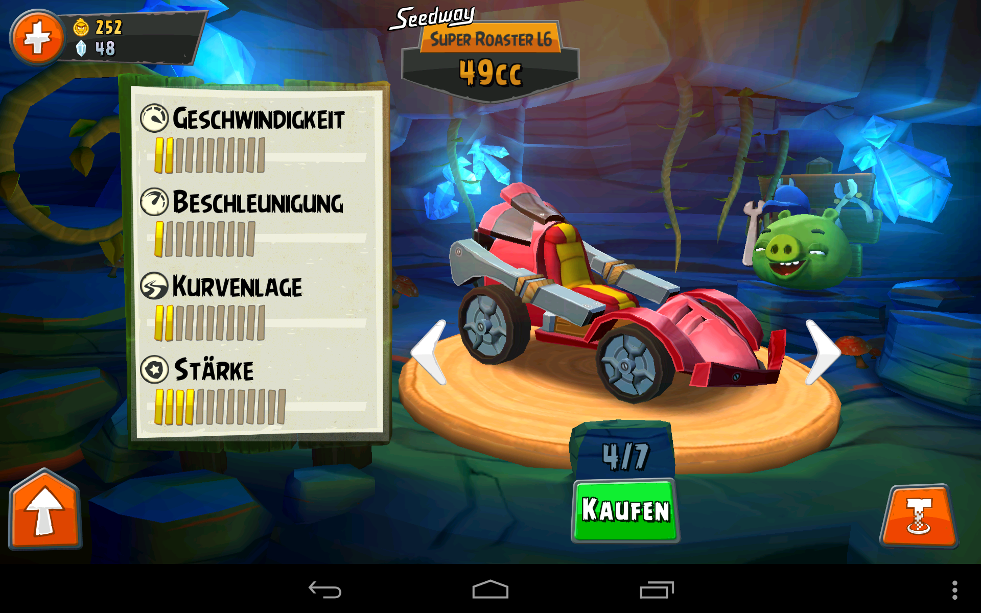 Fahrzeuge lassen sich in den vier Kategorien Geschwindigkeit, Beschleunigung, Kurvenlage und Stärke aufmöbeln.