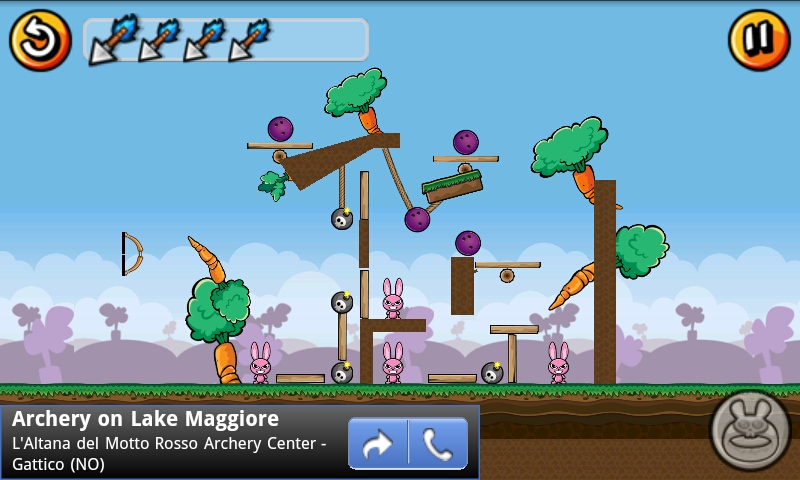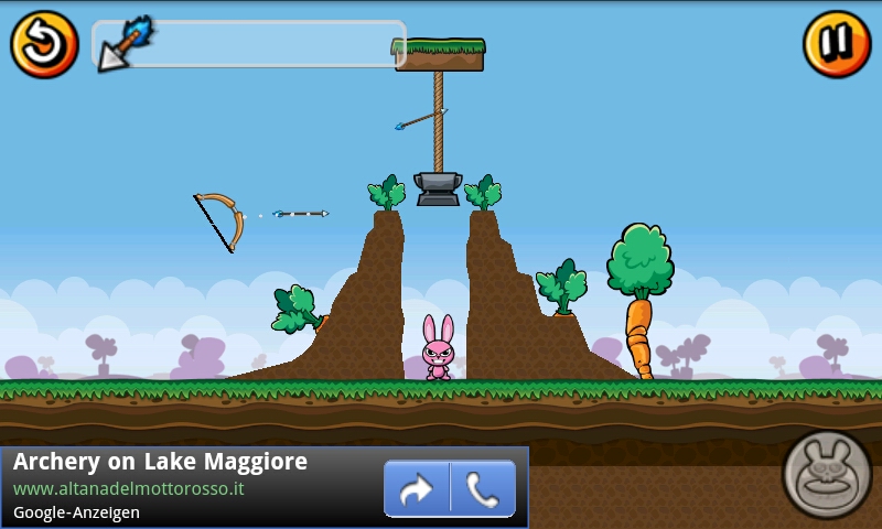 Vom Prinzip her ist Bunny Shooter genau wie Angry Birds. Der Unterschied liegt in den Figuren und der „Waffe“. Hier schießt man mit Pfeil und Bogen und, im Vergleich mit den bösen Vögeln, statt auf Eier auf rosa Hasen. Das war es aber dann auch schon wieder mit großen Unterschieden. Die Level sind genauso einfach gestaltet, einzig die Fallen und Verstecke der Hasen sind anders. Auch das Bewertungssystem mit einem bis drei Sternen ist dem der Konkurrenz nicht gerade unähnlich.