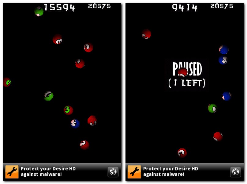 Grün vor Neid: Werden Ihre blauen zu roten Kugeln, werden diese nach einigen Sekunden gründ und somit berührbar (Bild rechts). Fiese Pause: Mehr als ein paarmal pausieren ist nicht, wenn sie den Highscore knacken wollen (Bild rechts).