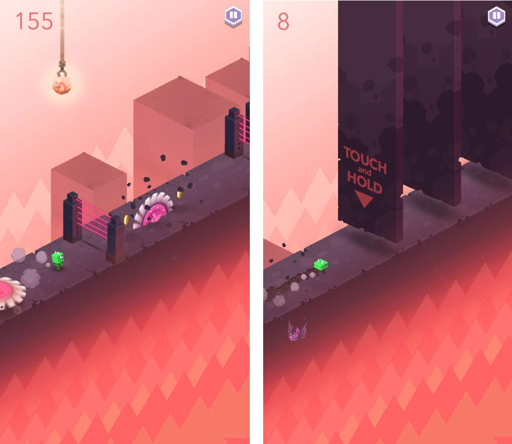 Die Handlung: Ein unscheinbares grünes Männchen mit unstillbarem Bewegungsdrang rast auf verschiedene Hindernisse zu. Das Einzige, was es davor bewahrt, zersägt oder zerquetscht zu werden, ist das beherzte Eingreifen des Spielers. Ein kurzes Antippen des Displays bringt den grünen Helden zum Hüpfen. Lässt der Spieler hingegen den Finger am Bildschirm, duckt sich das Männchen und rutscht unter Hindernissen durch.
