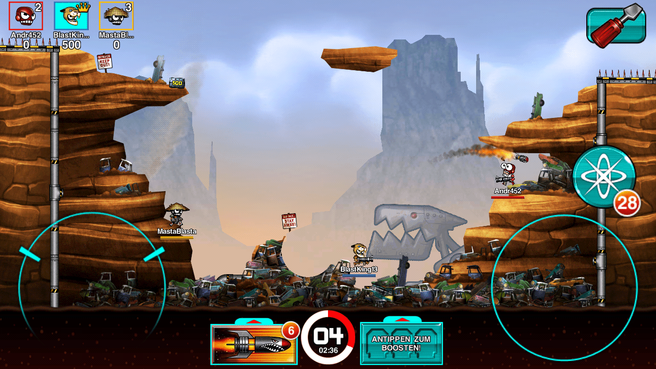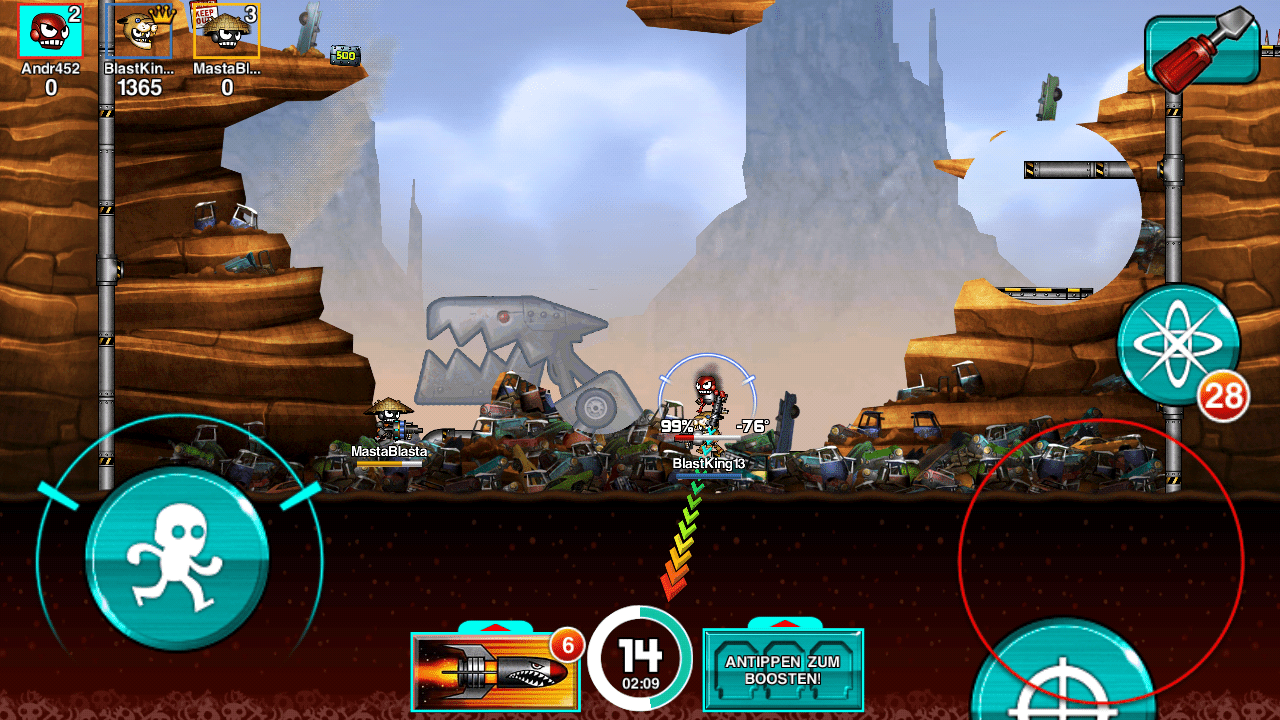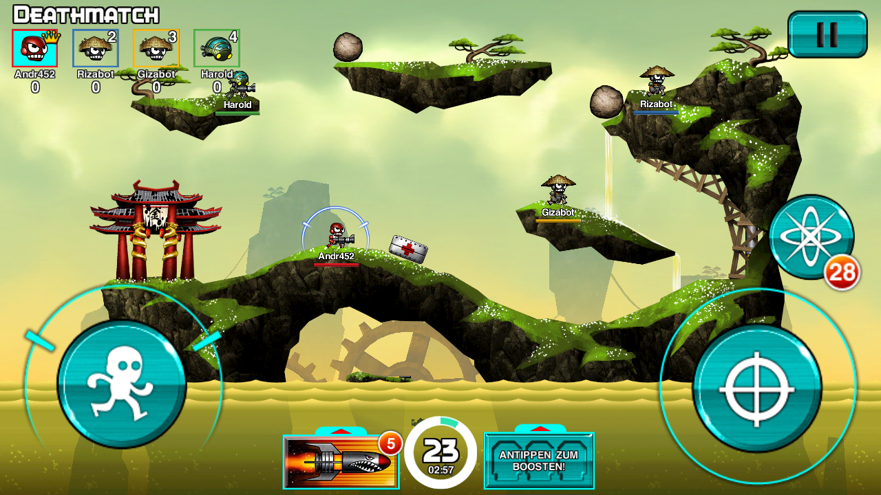 Ähnlich wie beim Vorbild Worms feuerst du deine Waffen durch Tippen und Ziehen auf dem Bildschirm ab.
