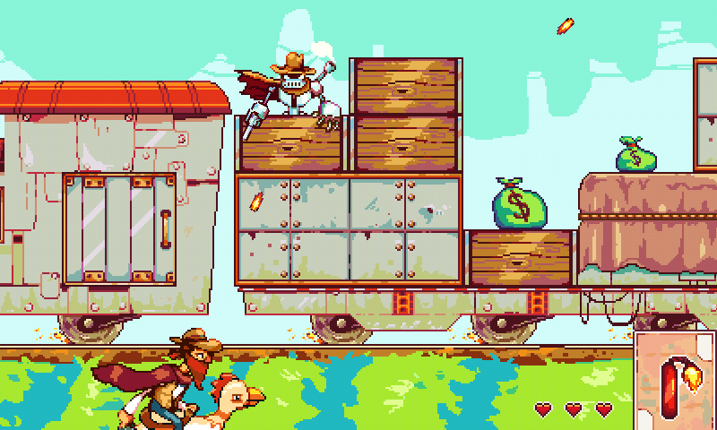 In ‘Chicken Bandit’ reitest du auf einem Huhn durch den wilden Westen und versuchst, so viele Schätze wie möglich aus vorbeifahrenden Zügen zu rauben. (€ 2,41)