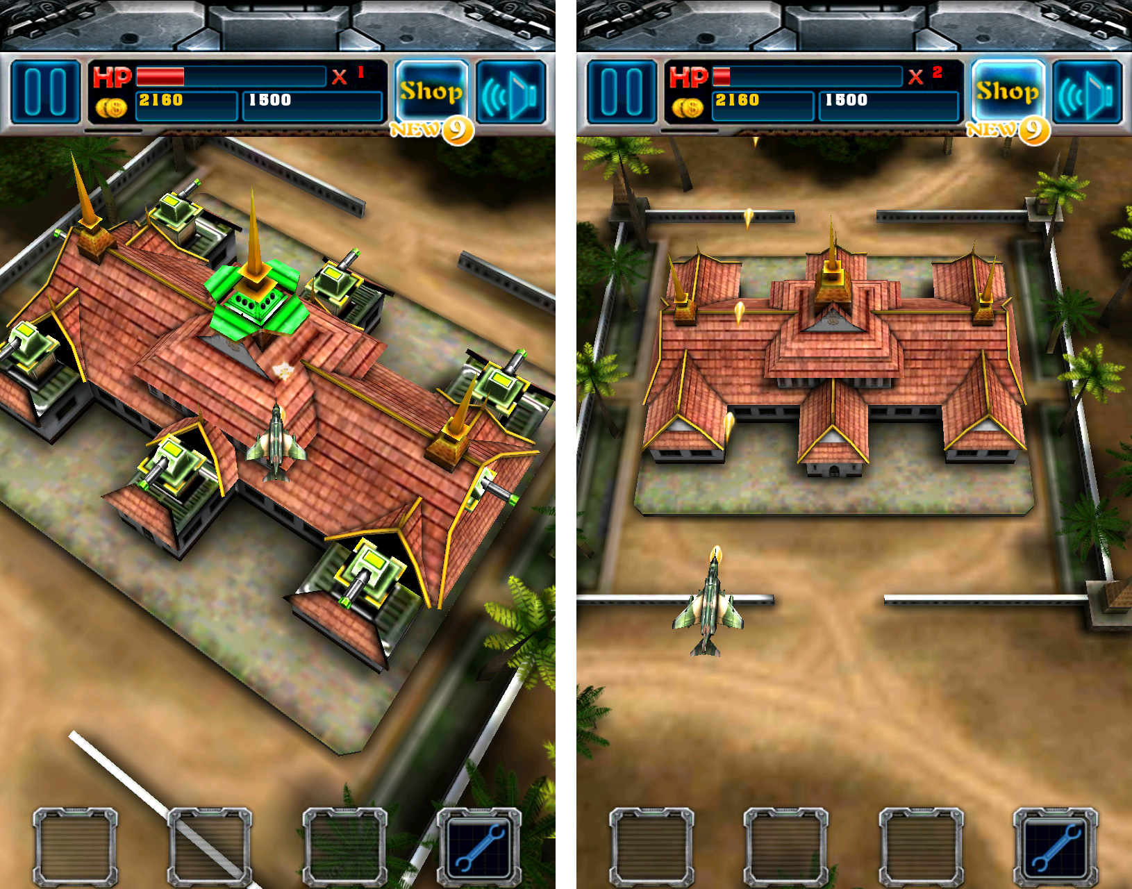 Aus diesem Grund darfst du die herunterfallenden Münzen in Upgrades investieren – die als „Skills“ bezeichneten Werkzeuge erscheinen auf der Unterseite des Bildschirms und lassen sich wie Zauber alle paar Sekunden einmal aktivieren. Sie erledigen diverse nützliche Aufgaben, der Repair-Skill heilt deinen Flieger und ist deshalb besonders empfehlenswert.