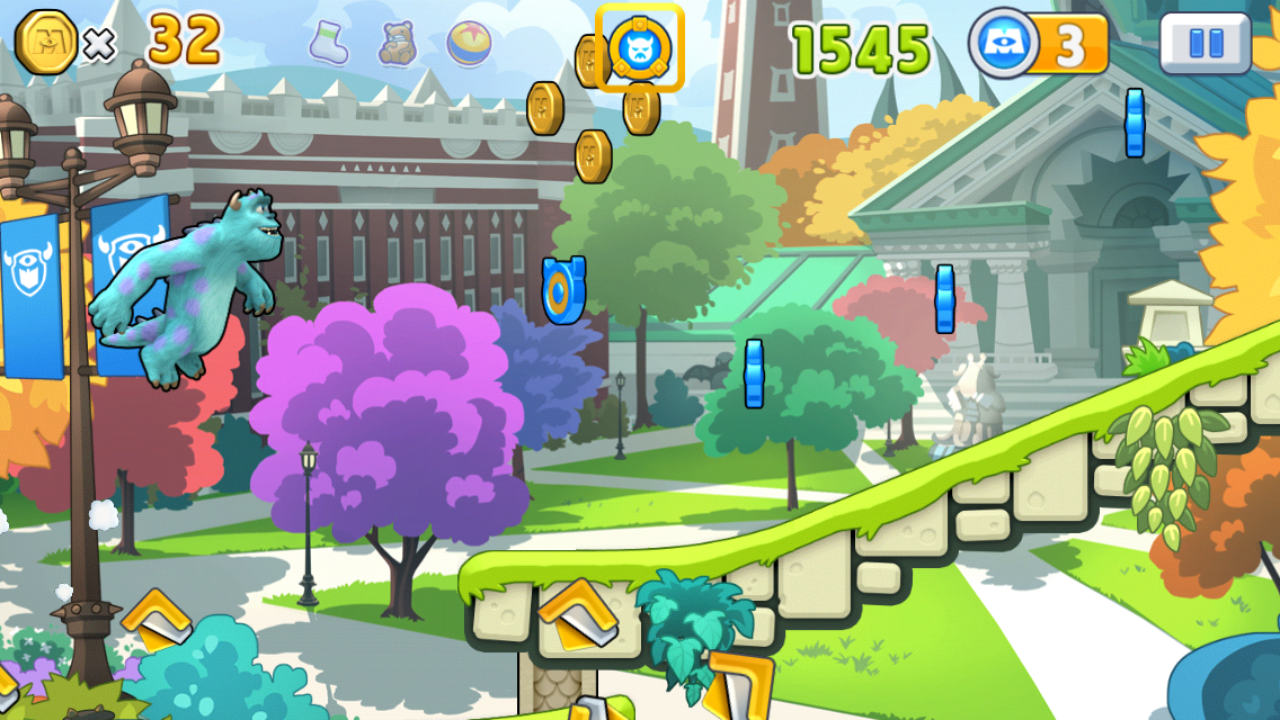 Gespielt wird in Teams, du läufst aber immer nur mit einem Monster. An bestimmten Stellen der zweidimensionalen Strecke kannst du dich verwandeln – das ist manchmal durchaus hilfreich, immerhin hat jedes Monster spezielle Fähigkeiten. Der kleine Mike beispielsweise springt hoch und läuft schnell, steht aber bei Hindernissen aus Stein an. Hier solltest du auf Sulley switchen, für den sind Mauern kein Problem. Mit der Zeit schaltest du andere Teams frei, optional kannst du diese auch im Shop erwerben – für Spielmünzen oder reales Geld.