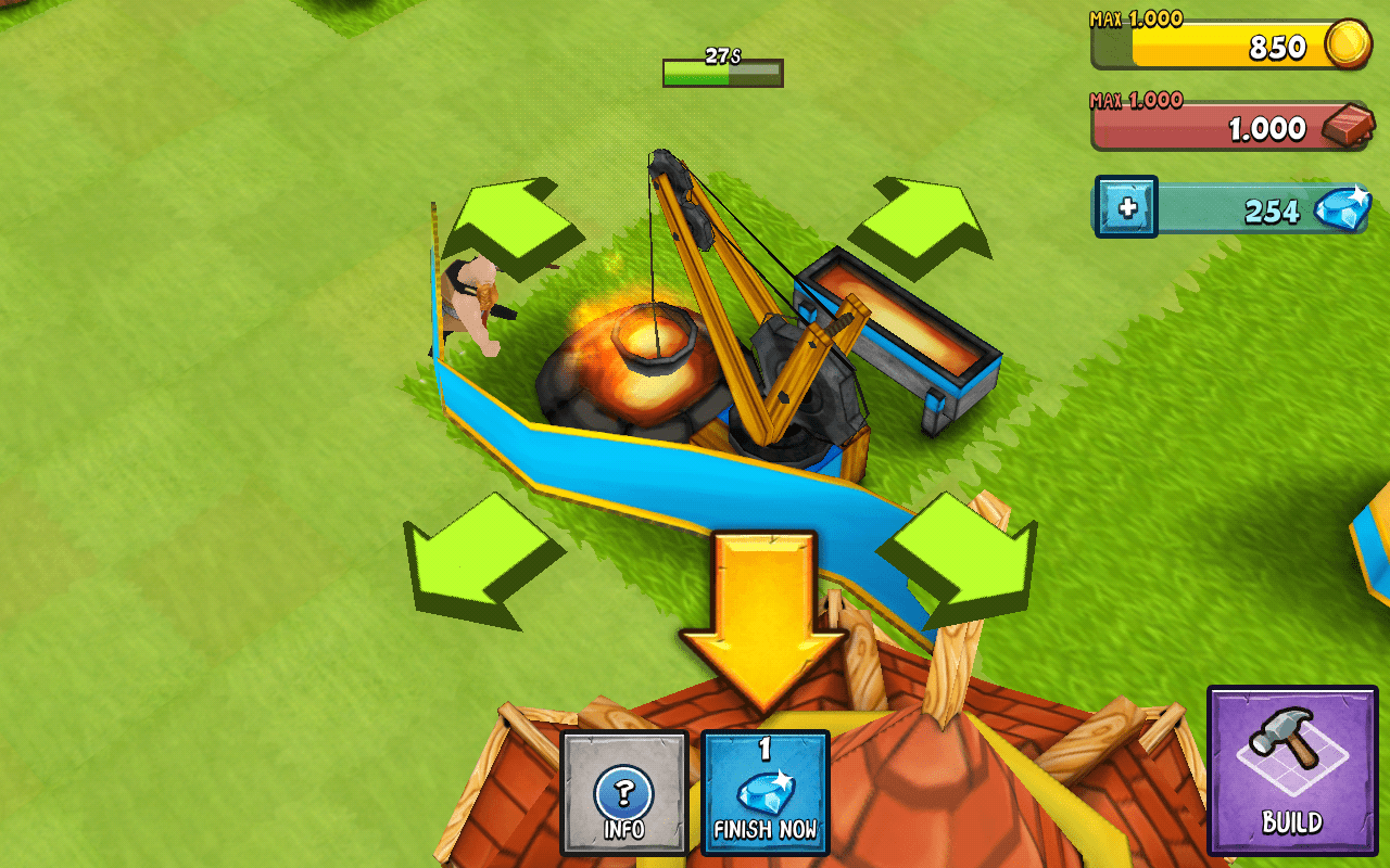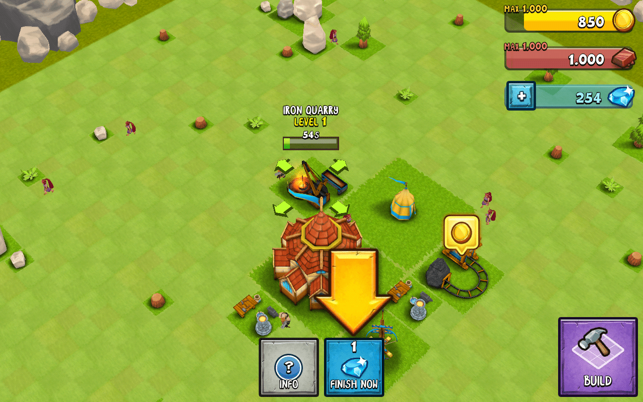 Greed for Glory ist kostenlos, der Entwickler bietet keine Paid-Version an. Stattdessen erwirtschaftet er ein Zubrot durch den Verkauf von Diamanten, die dir das Beschleunigen der diversen Bauprozesse ermöglichen. Wenn du kein Geld investierst, darfst du warten – die Errichtung komplexerer Gebäude dauert dann schon mal die eine oder andere Stunde.
