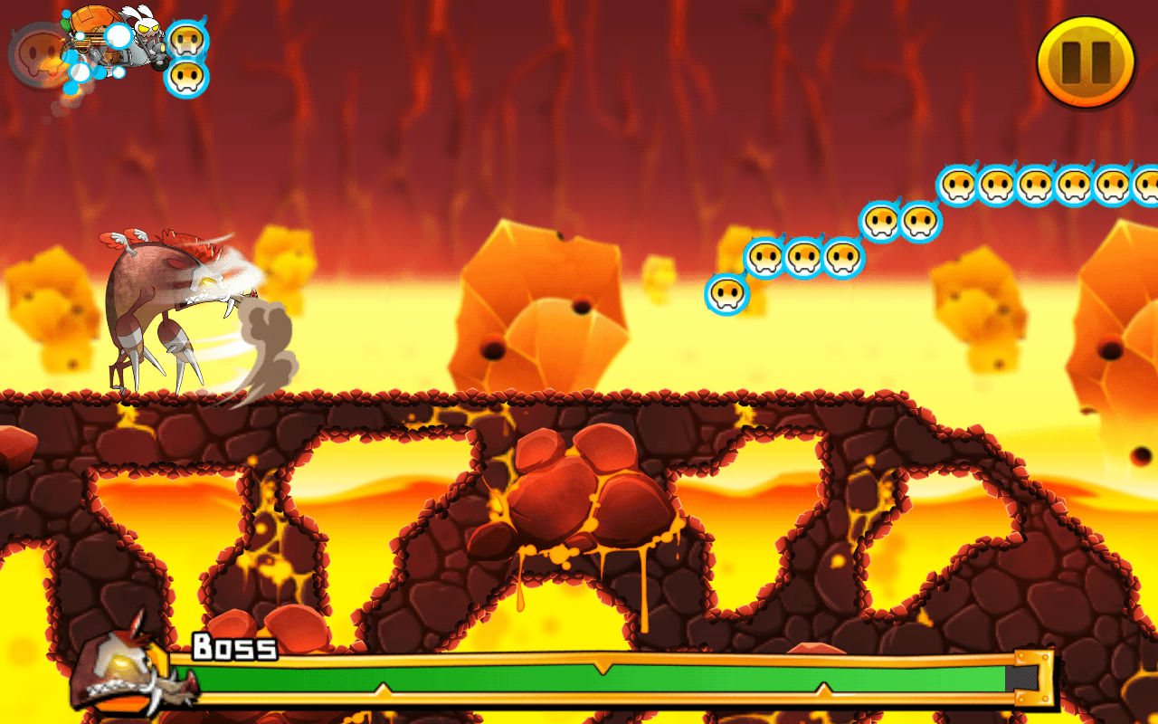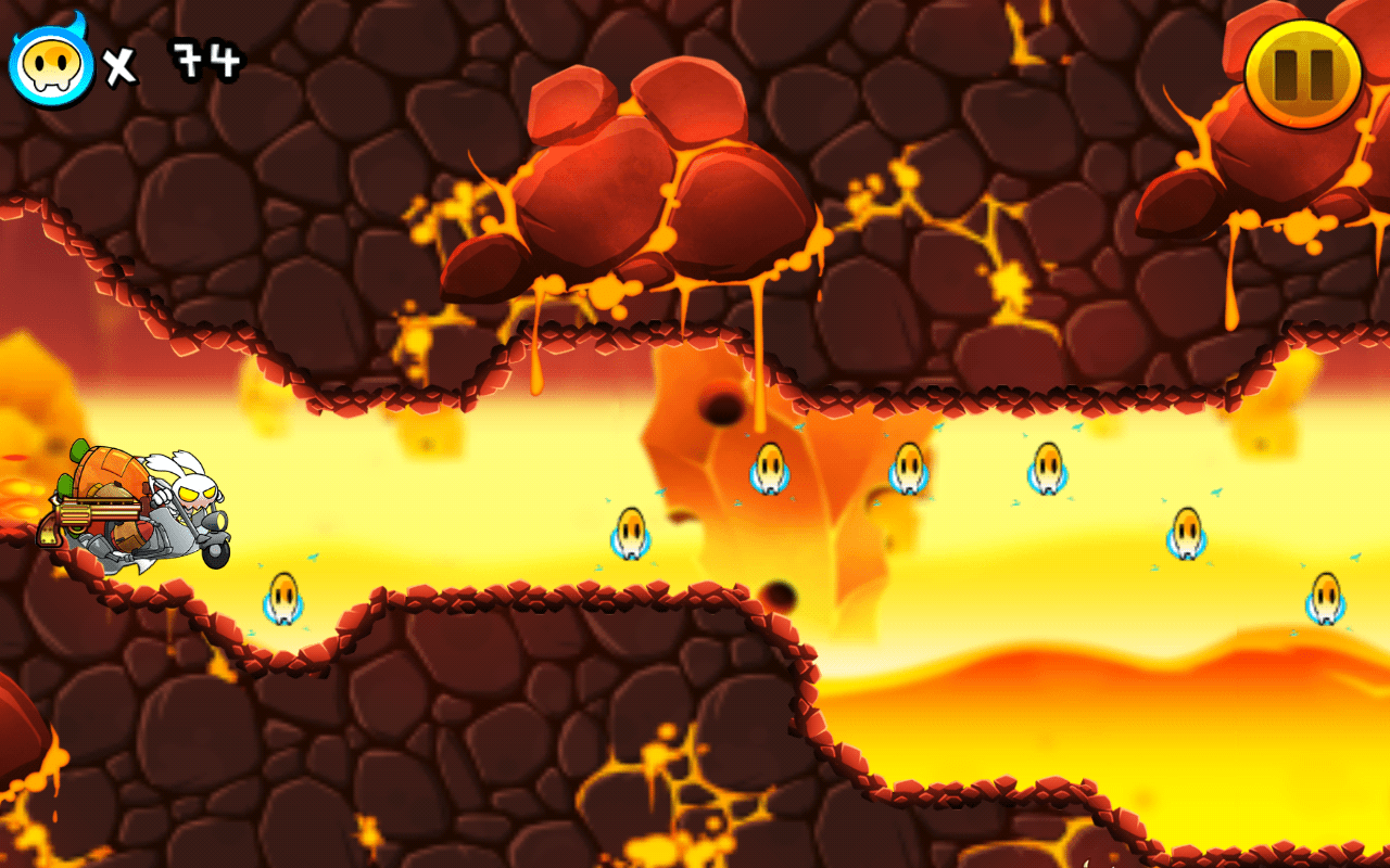 Die Steuerung von Hell Yeah ist denkbar einfach und lässt sich mit nur zwei Fingern bewerkstelligen. Die Flughöhe des Hasen lässt sich nicht direkt steuern: stattdessen feuerst du von Zeit zu Zeit durch Druck auf die Boost-Taste die Raketen des Jetpacks ab. Diese schleudern das Langohr nach oben – die auch in der Hölle wirksame Schwerkraft arbeitet in die andere Richtung. Zum Abfeuern der Kanone tappst du auf den anderen Button.
