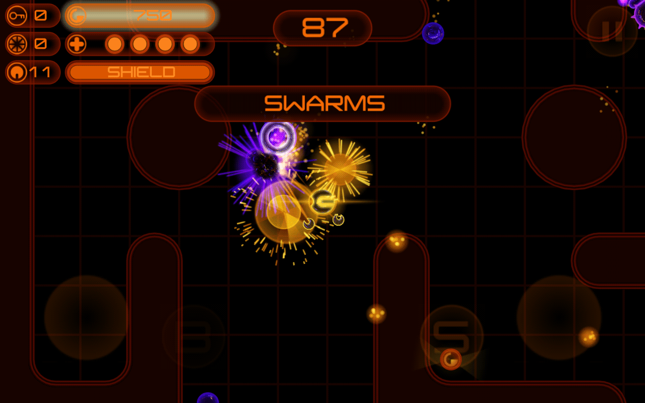Die Steuerung des Spiels ist simpel. Der linke Daumen navigiert das Raumschiff durch die Maps, mit dem rechten Daumen legst du die Feuerrichtung der Kanone fest. Ein durch Druck auf den Schild-Knopf aktivierbares Abwehrsystem hält gegnerischen Beschuss fern.