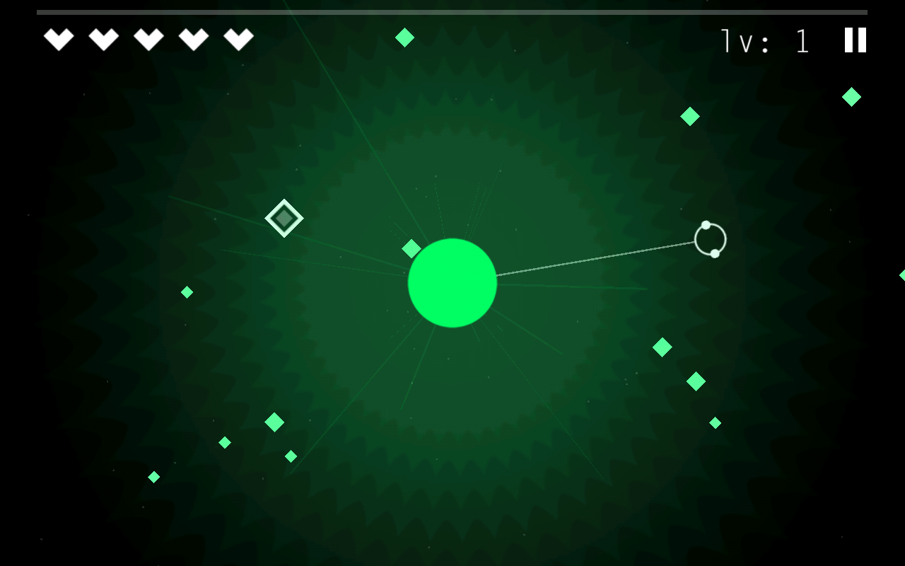 Leider ist das leichter gesagt als getan. Du steuerst einen rotierenden Greifer, dessen Abstand zum Mutterplaneten sich je nach Wunsch anpasst. Da du die Rotationsgeschwindigkeit nicht beeinflussen darfst, artet das schnell in ein nervenkitzelndes Geschicklichkeitsspiel aus. Außerdem musst du herumfliegender Antimaterie ausweichen, da sie den Greifer zerstört und so deine Lebensenergie reduziert.