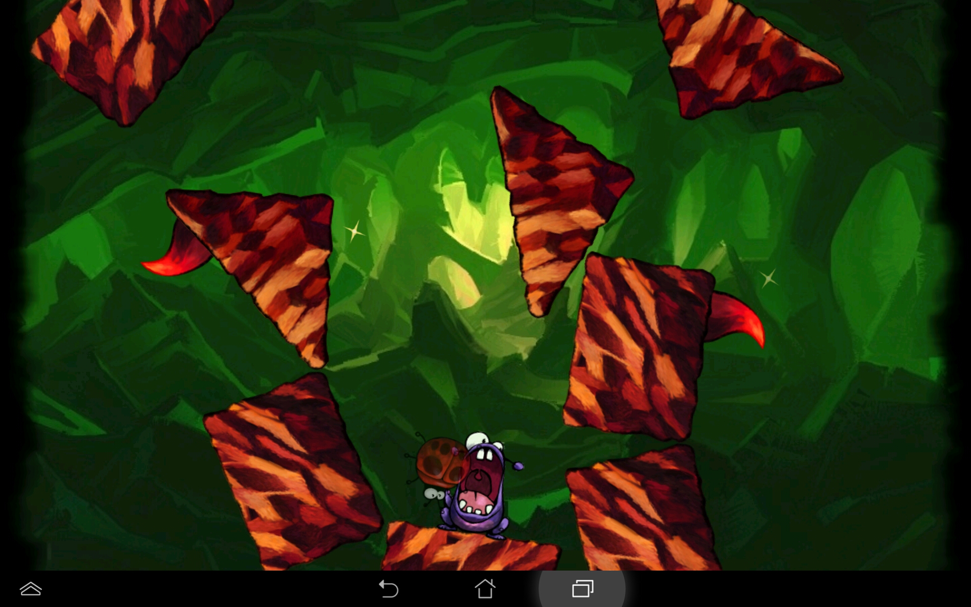 Das machst du geschickterweise mit Hilfe des Neigungssensors deines Smartphones. Apropos geschickt: Ein wenig Geschick ist schon vonnöten, um sich den Weg zum Monster zu bahnen. Schließlich ist er gespickt von Dornen, Sperren und anderen Gemeinheiten. Wie in einem klassischen Kugellabyrinth musst du also den Käfer ganz sachte durch die Monsterhöhle an den Dornen vorbeimanövrieren und auf dem Weg zum Ziel auch noch möglichst alle drei Sterne einsammeln. Und einen Zeitbonus willst du sicher auch einspielen, also darfst du dir nicht beliebig lang Zeit lassen.