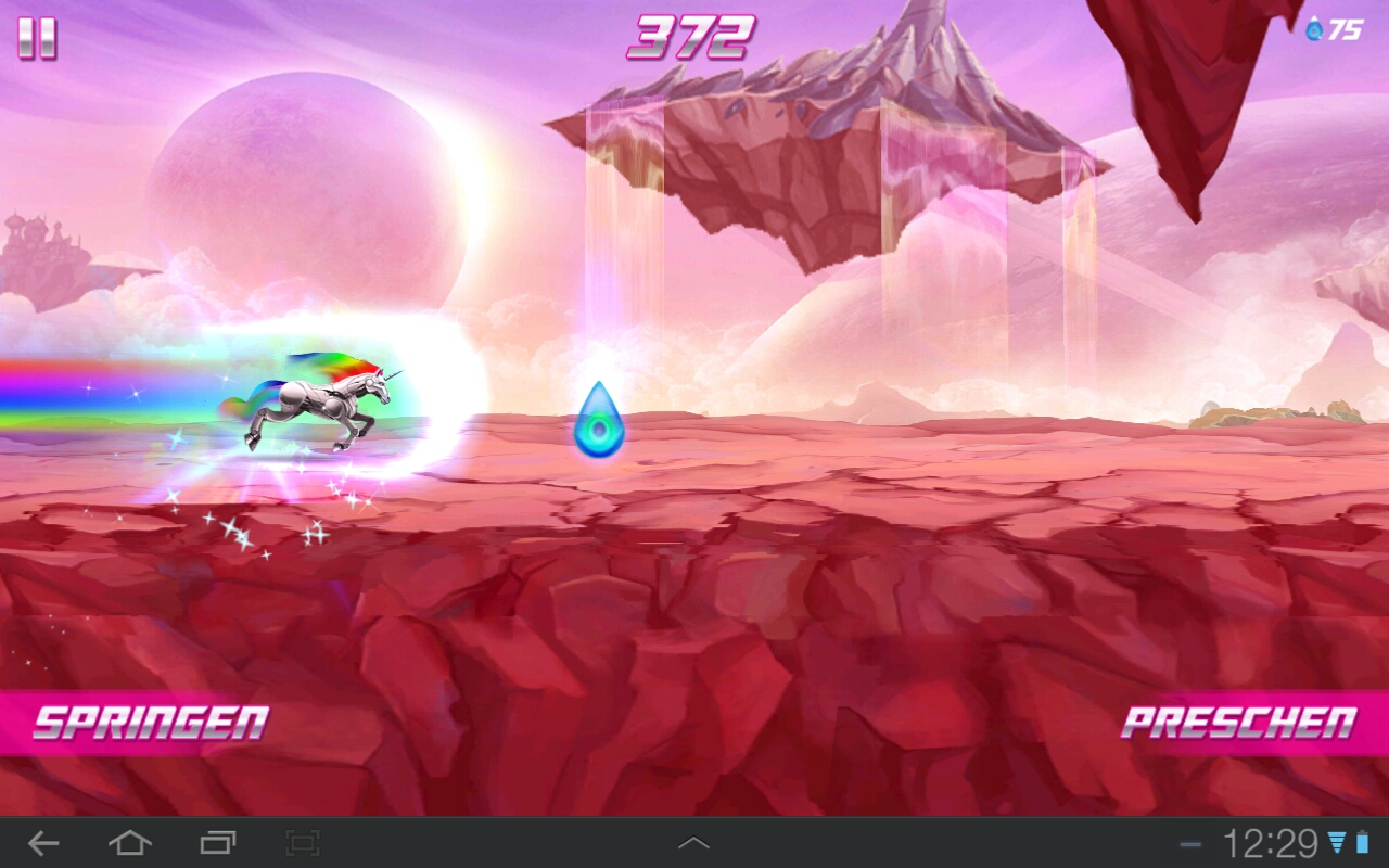 Gesteuert wird das Roboter-Einhorn mit zwei virtuellen Tasten am unteren Spielfeldrand. Jede der Tasten ist für eine der Hauptfähigkeiten des Robotereinhorns zuständig. Die linke verwendest du zum Springen. Damit überwindest du Hindernisse, wie Schluchten oder Felsbrocken. Die rechte Taste aktiviert deine Spezialfähigkeit „Preschen“. Damit gibst du deinem Einhorn gewissermaßen die Sporen und es galoppiert über das Spielfeld – zumindest für ein paar Sekunden. Die meisten Hindernisse lassen sich durch bloßes Springen überwinden. Oft musst du aber beide Fähigkeiten geschickt kombinieren, um weiterzukommen.