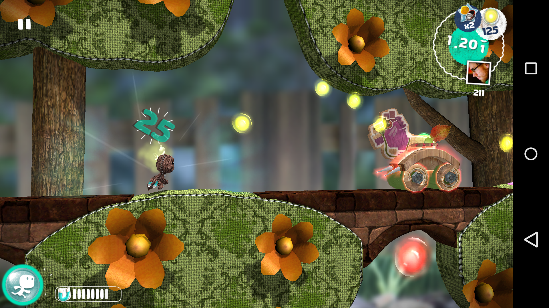 Grafik, Sound und Atmosphäre sind überraschend nahe am Original, vor allem die gestochen scharfen Umgebungen wirken so, als stammen sie direkt vom großen PlayStation-Bruder. Natürlich mussten zu Gunsten der Bedienbarkeit aber Vereinfachungen vorgenommen werden: Der namensgebende Protagonist “Sackboy” läuft ohne dein Zutun nach rechts, Sprünge werden mit einem Wisch nach oben oder einem Tipp auf den Bildschirm ausgeführt. Per Wisch nach rechts kann eine Art Mini-Turbo aktiviert werden, mit dem sich unter anderem klebriger Schleim überwinden lässt. Damit das Ganze nicht langweilige wird, verfolgt Sackboy ein fieses Monster, zudem stellen sich ihm allerhand dubioser Kreaturen in den Weg, denen er entweder ausweichen oder in bester Super Mario-Manier auf den Kopf springen kann.