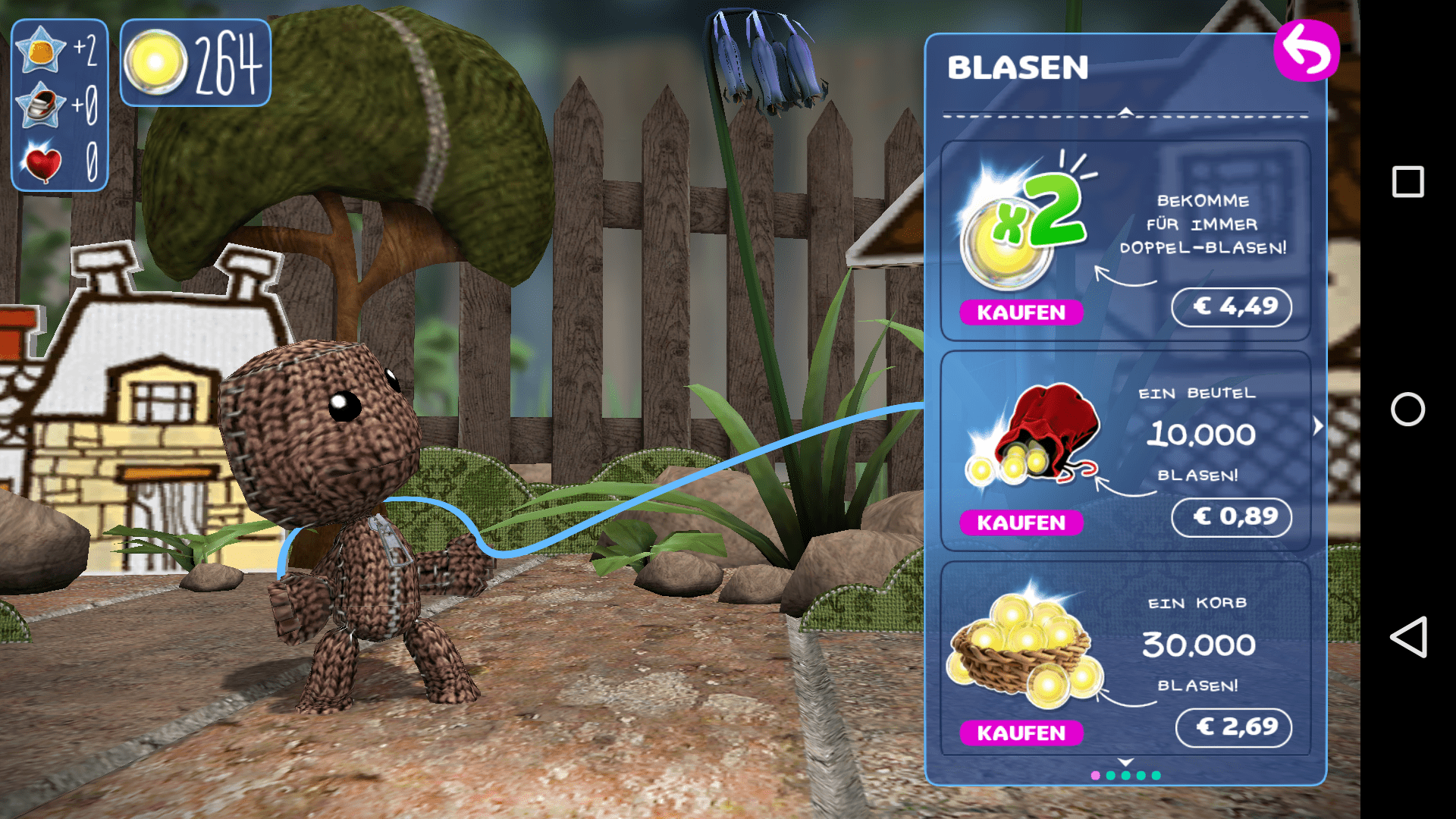 Run Sackboy! Run! ist an sich kostenlos, deshalb finanziert sich der Spaß wenig überraschend über In-App-Käufe. Konkret in Form von Blasen-Pakete, bei denen 10.000 Blasen beispielsweise 0,89 Euro kosten, ein genereller Blasen-Verdoppler kostet hingegen satte 4,49 Euro. Außerdem lassen sich Herzen, mit denen während eines Laufes an einem Checkpoint neu gestartet werden kann, mit echtem Geld kaufen. Diese Käufe sind aber immer optional und hindern dich nicht daran, so oft du willst neu zu beginnen. Es gibt also keine nervigen Wartezeiten oder Energie-Level, die nach einer Zeit verbraucht sind.