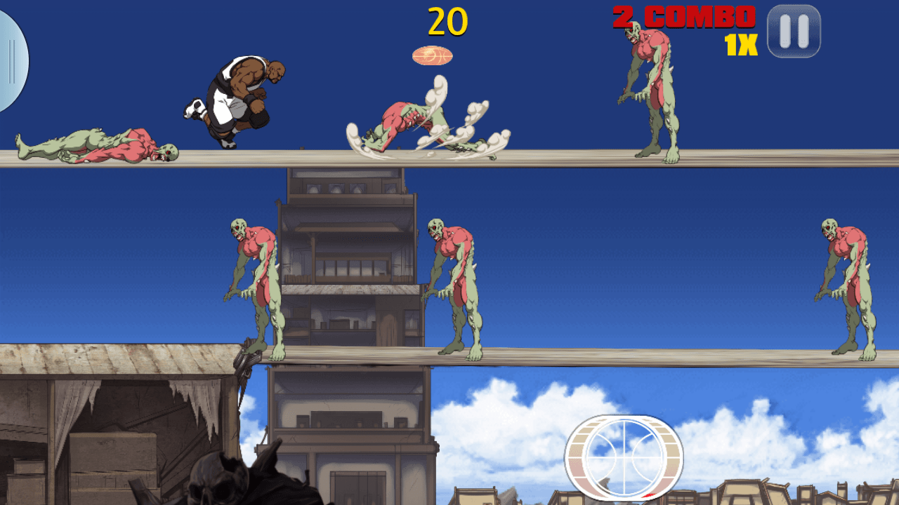 Das Spielprinzip ist einfach: Mit einem Wisch nach oben bzw. unten springst du zwischen den drei Ebenen hin und her. Dabei musst du versuchen, alle Zombies niederzurennen. Doch O’Neal kann nicht alle sofort umlegen. Einige sind stärker und müssen zunächst einmal mit einem Basketball getroffen werden. Diesen feuerst du mit einem Tipp auf den Touchscreen ab. Damit das Ganze auch ein wenig anspruchsvoller wird, gibt es auch einige Zombies, die sich nicht umnieten lassen. Diesen solltest du tunlichst ausweichen. Nach einer bestimmten Anzahl von getöteten Zombies kannst du auch noch eine Spezialfähigkeit aktivieren, die dich für kurze Zeit schneller laufen lässt und den Protagonisten unverwundbar macht. Zudem feuert Shaq einen riesigen Strahl ab, der allen Zombies vor ihm den Garaus macht.