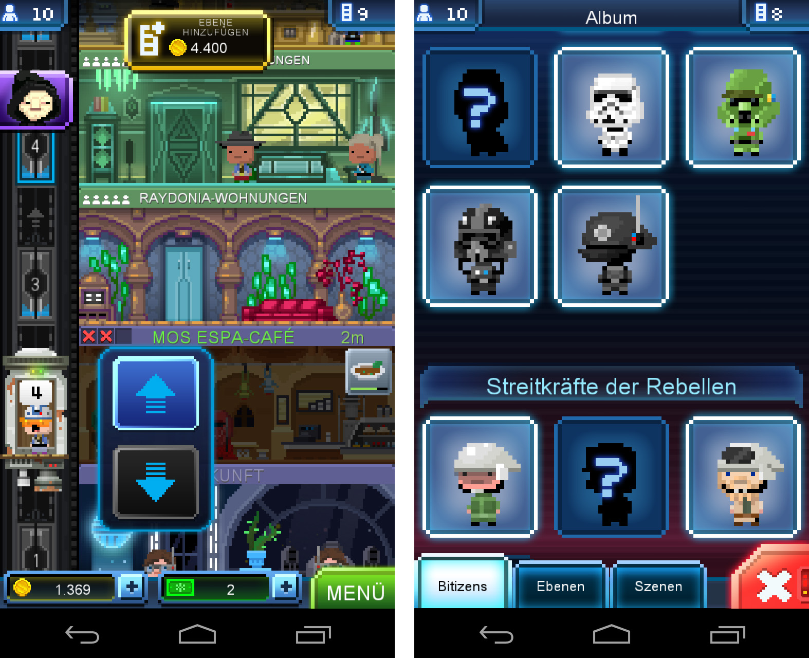 Das Vorbild dieser App ist klar erkennbar das erfolgreiche Spiel Tiny Tower – eine Wirtschaftssimulation, in der man die Aufgabe hat, einen Wolkenkratzer zu errichten. Bei Tiny Death Star baust du stattdessen Ebene für Ebene den Todesstern auf.