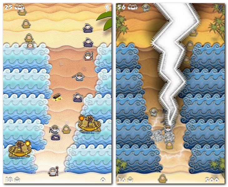 Allerdings hat die Thematik weniger mit Josef und Maria, als mit einer anderen Gestalt religiöser Geschichte zu tun, nämlich Mose. Dessen Rolle übernimmt man kurzerhand übrigens selbst, schließlich ist es die eigene Aufgabe, mittels Swyping das vor einem liegende Meer so zu teilen, dass die getreuen Gefolgsleute nicht in dessen Fluten versinkend ihr Dasein beenden müssen. Erfreulicherweise fällt diese göttliche Fähigkeit einfach, denn ihr müsst nur auf die Stellen tippen, die ihr geteilt haben wollt – das Meer öffnet sich an dieser Stelle für ein kleines Stück und ihr müsst nur noch warten, bis die zu rettenden Anhänger durchgeschritten sind.  Probleme macht euch dabei nicht nur das Schneckentempo der älteren Generation, sondern auch herumlaufende Mumien, die eurem ohnehin schon geplagten Volk noch zusätzlich zusetzen. Glücklicherweise könnt ihr die wandelnden Mullbinden nicht nur ins Wasser laufen lassen, sondern auch göttliche Fähigkeiten wie beispielsweise Blitze walten lassen. Und wenn alles andere nichts hilft, dann könnt ihr immer noch Jesus darum bitten, euren Leutchen das mit dem Unbeschadet-übers-Wasser-laufen zu erklären!