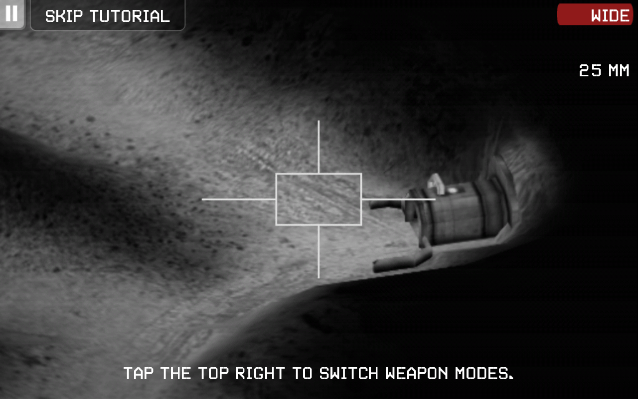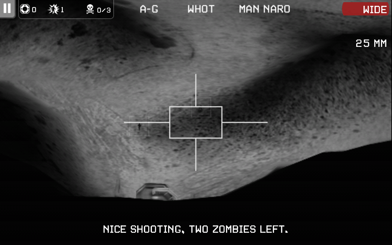 Zur Erleichterung des Anvisierens zeigt das Spiel einen „Rand“ um die im Spielfeld befindlichen Untoten an. Dadurch ist es leichter, die Silhouetten vor dem Hintergrund zu treffen – leuchtet ein Zombie in Rot auf, so musst du ihn sofort erledigen.