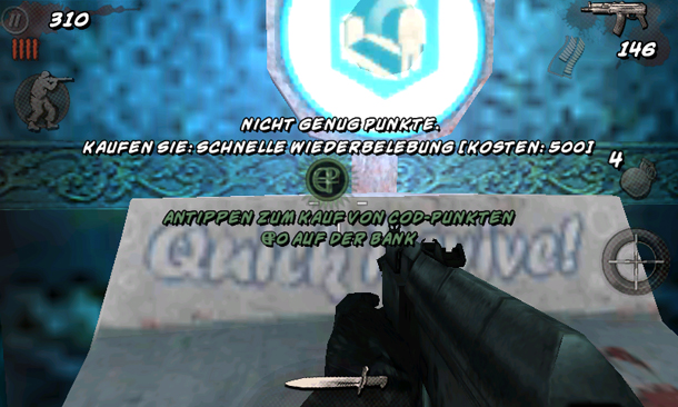 Als „Währung“ dienen Punkte, die am einfachsten durch das Umlegen von Zombies erwirtschaftet werden können. Nachdem einige Zombies umgenietet sind, sollte sich das Alter Ego des Spielers schnellstmöglich zu einer der „Kreidewaffen“ begeben – dort gibt es Munition und neue Schusswaffen.