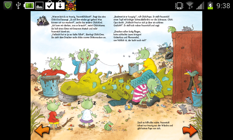 Die mit € 3,59 nicht gerade billige App bietet dennoch eine Menge für ihr Geld. Die Geschichte ist zunächst einmal um einiges länger als „Kuckuck, da bin ich!“. Auch die diversen Animationen, welche auf den Buchseiten eingebaut wurden, finden die Kinder einfach toll. Und die Geschichte, die sich um das kranke Geburtstagskind Feuerstuhl dreht, gefällt besonders gut. Die Kinder werden zudem aktiv in die Erzählung eingebunden. So können sie bei der Geburtstagsparty Reifen über Drachenschwänze werfen und ein Feuerwerk anzünden. Natürlich kann das Kind auch bei dieser App selbst lesen, die eigene Stimme aufzeichnen und dann abspielen, oder einer bekannten Vorlesestimme den Job überlassen.