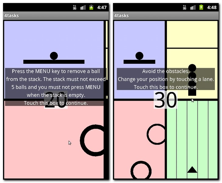 Man sieht worauf’s hinaus läuft: Sie müssen jedes hinzukommende Spiel GLEICHZEITIG mit den bereits laufenden führen! Nach der 20. Sekunde etwa wird der Bildschirm bereits in vier Teile geteilt und Sie bekommen das dritte Spiel hinzu, bei dem aufeinanderfallende Bälle abgetragen werden müssen. Nicht weniger als ein, nicht mehr als fünf Bälle gleichzeitig auf dem Screen, lautet die bescheidene Vorgabe. Mit der 30. Spielsekunde kommt dann das letzte Spiel hinzu, eine Art Hindernislauf für Retro-Enthusiasten: Per Fingerdruck soll Ihre Figur näherkommenden Sperren auf eine der 5 möglichen Alternativen ausweichen.
