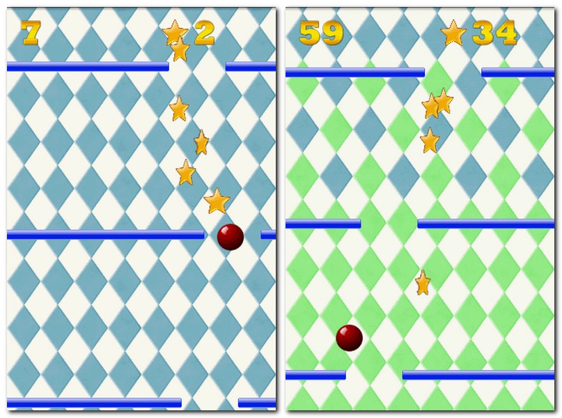 Deshalb gehts bei Drop auch nur darum, die eigene Highscore zu knacken. Dazu muss die Kugel immer weiter nach unten durch Lücken in den erscheinenden Wänden geführt werden, wobei es für jede passierte Lücke Punkte gibt. Wer es darüberhinaus schafft, eine Lücke zu passieren, nur einmal oder überhaupt gar nicht auf die Wand zu prallen, bevor er die nächste Lücke passiert, der erhält wertvolle Bonussterne die am Ende zur Highscore gezählt werden. Darüberhinaus gibt es nichts, nur die stetig schneller auftauchenden Wände und die mit der Zeit immer größer werdende Hektik beim Reagieren, bis man dann irgendwann einfach verlieren muss. Keine Gegner, keine sonstigen Hindernisse, kein Schnickschnack. Simplizität pur!