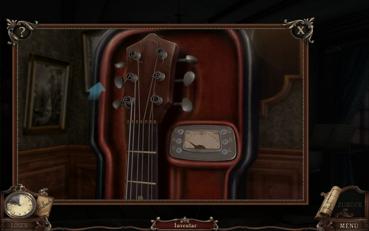 Das erledigst du in bester Point&Click-Manier. Das bedeutet, dass du dich Schritt für Schritt durch die Räume arbeitest. Denken ist dabei wichtiger als Action. In einigen Zimmern findest du zudem Gegenstände, die dir beim Bewältigen der Aufgaben helfen. Ein gutes Beispiel dafür ist das Gitarrenstimmgerät – es erlaubt dir, ein herrenlos herumliegendes Saiteninstrument zu stimmen.