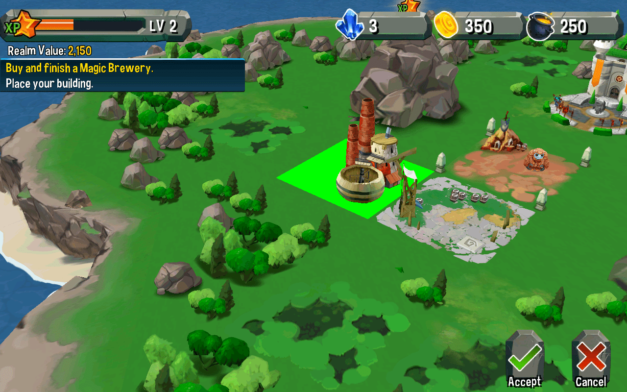 Die Spiel-Engine von Giant Realms arbeitet nach dem Echtzeit-Prinzip. Das bedeutet, dass der Bau komplexerer Strukturen schon mal einige Minuten in Anspruch nimmt – während dieser Zeit kannst du mit dem Handy aber wie gewohnt weiterarbeiten. Alternativ ist es möglich, den Bauprozess durch das Investieren eines Diamanten sofort zu beenden. Diese sind durch In-App-Purchase erhältlich und finanzieren die weitere Entwicklung des Titels.