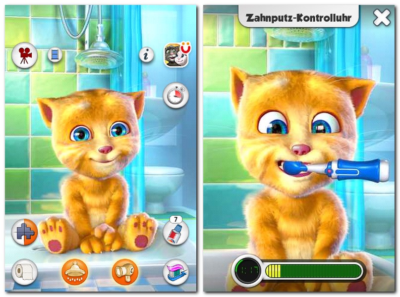 Die Katze plappert alles nach, was du ihr vorsprichst. Zudem kannst du sie streicheln und kitzeln, um sie zum Schnurren oder zum Kichern zu bringen. Das pädagogische Ziel der App ist es, widerspenstigen Kindern die Vorbereitungen auf das Schlafengehen schmackhaft zu machen. Deshalb kannst du die Katze auch duschen, trocken föhnen und ihr die Zähne putzen. Ein Timer soll die Kinder dazu animieren, sich für das Zähneputzen genügend Zeit zu nehmen. Erledigst du brav diese Aufgaben, dann erhalten die Kleinen als Belohnung die einzelnen Teile einiger Puzzles.