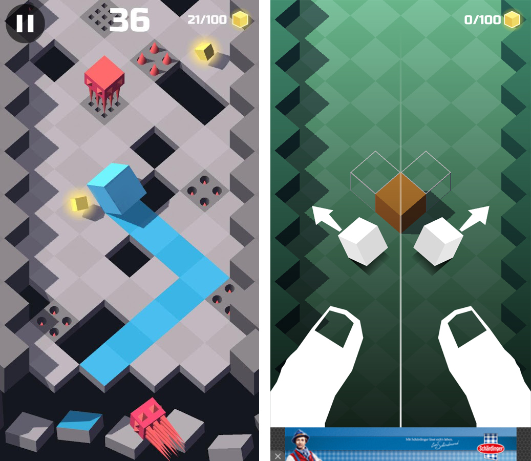 Und dann geht es los. Schnell tippen ist angesagt. Denn der Boden beginnt sich – vom unteren Bildschirmrand beginnend – aufzulösen. Dumm nur, dass oben irgendwann jede Menge Hindernisse und Fallen auftauchen. Aber auch goldene Würfel, die wir unbedingt einsammeln sollten. Wenn wir da nicht schnell den Weg durch die Hindernisse finden, fallen wir unweigerlich ins Leere.