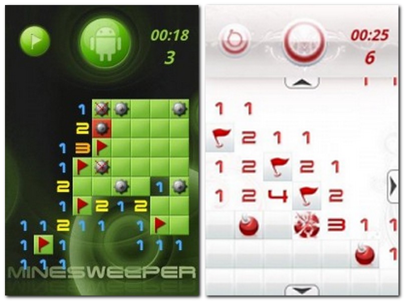 Suchtpotential mit Blickfang: aiMinesweeper ist eine der besten Android Umsetzungen (Bild links). Passend für winterliche Feiertage gibt’s auch ein schneeweißes Skin für die App (Bild rechts).