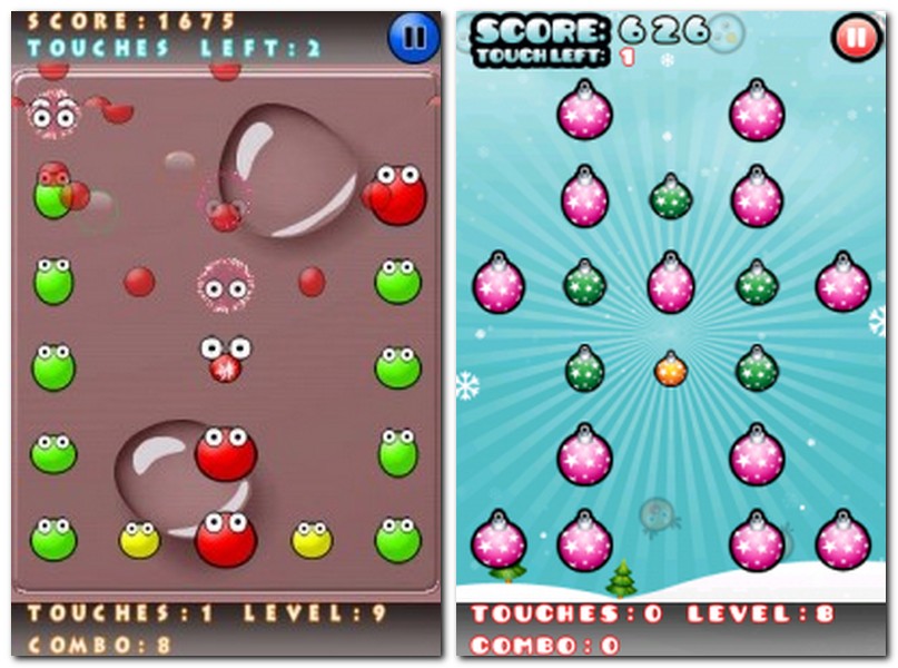 Und Plopp: Beim Antippsen zerbersten die roten Blasen in alle vier Himmelsrichtungen (Bild links). Downloadbare Spezialeditionen: Mit der Holiday Edition spielt sich’s zu Weihnachten besonders gut (Bild rechts).