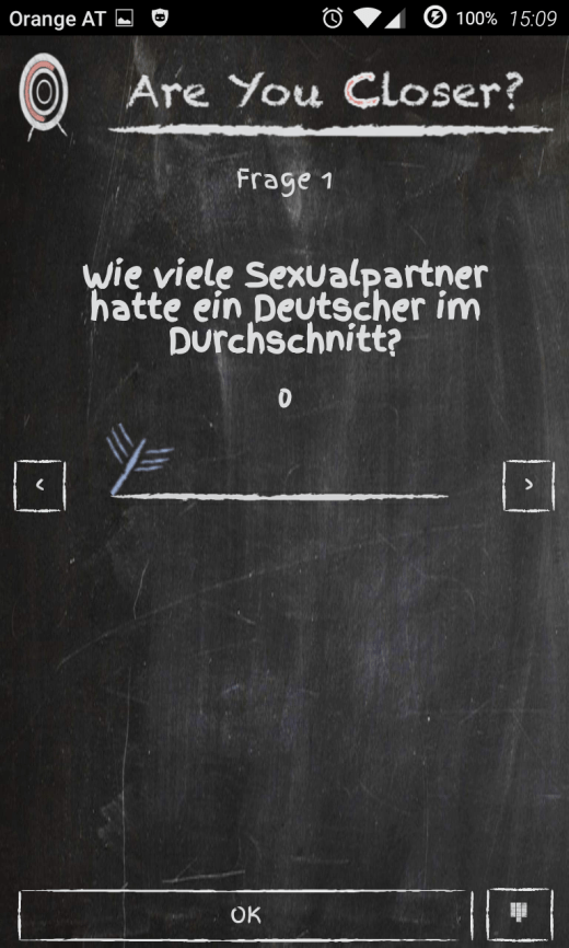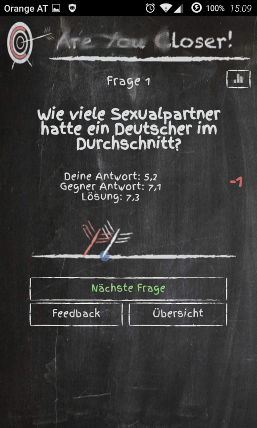 Wer kennt sie nicht, die unzähligen Multiple Choice Quizspiele aus dem Play Store? Davon hast du genug? Dann bist du hier richtig. Denn „Are you closer“ geht einen anderen Weg. Hier gibt es keine vier Antwortmöglichkeiten und Joker, sondern einfach einen Balken quer über den Bildschirm, auf den man sein Antwort absteckt. Dies setzt natürlich voraus, dass alle Fragen auch numerische Antworten haben und in der Regel nur geschätzt werden können. Ziel ist es, in fünf Fragen mehr Punkte zu erreichen als sein Gegner.