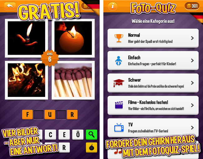4 Bilder 1 Wort hat im Play Store eingeschlagen wie eine Bombe. Kein Wunder, dass sich zahlreiche Nachahmer finden. Einer davon ist das deutschsprachige Foto-Quiz (kostenlos).