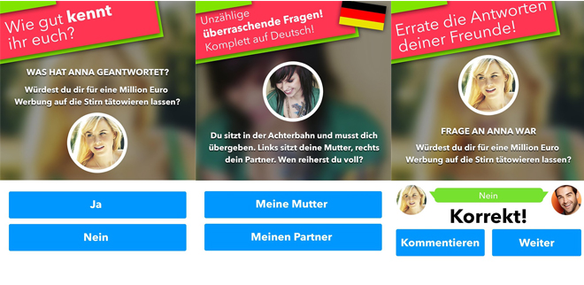 Mit dieser App sollst du deine Freunde mal so richtig kennenlernen. Das funktioniert, indem du bestimmte Fragen beantwortest und hernach errätst, wie dein Gegenüber auf diese Fragen geantwortet hätte. Übereinstimmungen treiben das Sympathometer nach oben. Du kannst aber die verrücktesten Fragen (so bezeichnet der Hersteller der App seine Fragen) auch fremden Personen stellen und so mit ihnen in Kontakt treten. Klar, du kannst mit ihnen auch via Chat in Kontakt treten und z.B. kommentieren, wieso du auf eine bestimmte Frage eine ebenso bestimmte Antwort gibst.