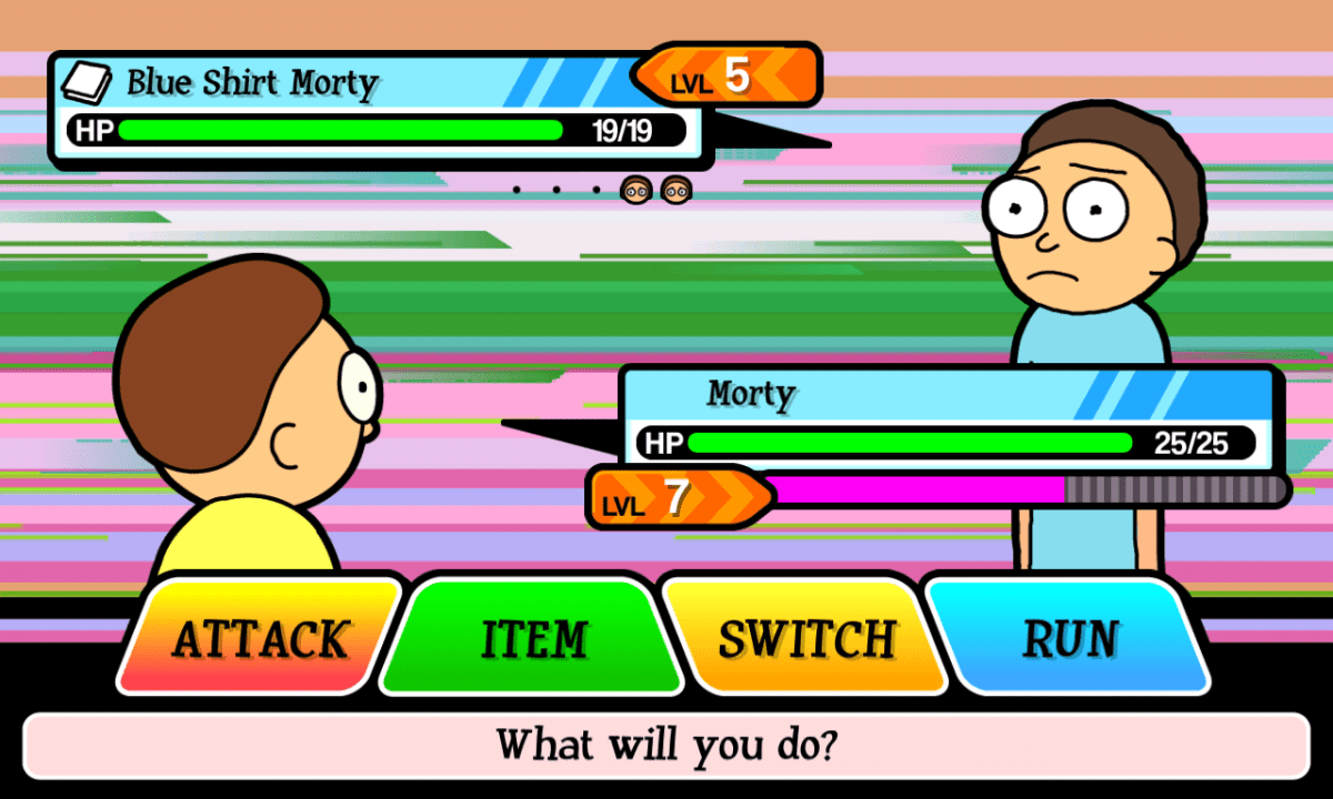 Action allerdings darfst du bei den Kämpfen zwischen den Mortys nicht erwarten: Ein Kampf läuft so ab, dass du – abwechselnd mit deinem Gegner – eine Angriffsart auswählst, und dann siehst du, wie sich nach den Angriffen die Anzeige des Gesundheitszustands der beiden Mortys verändert.