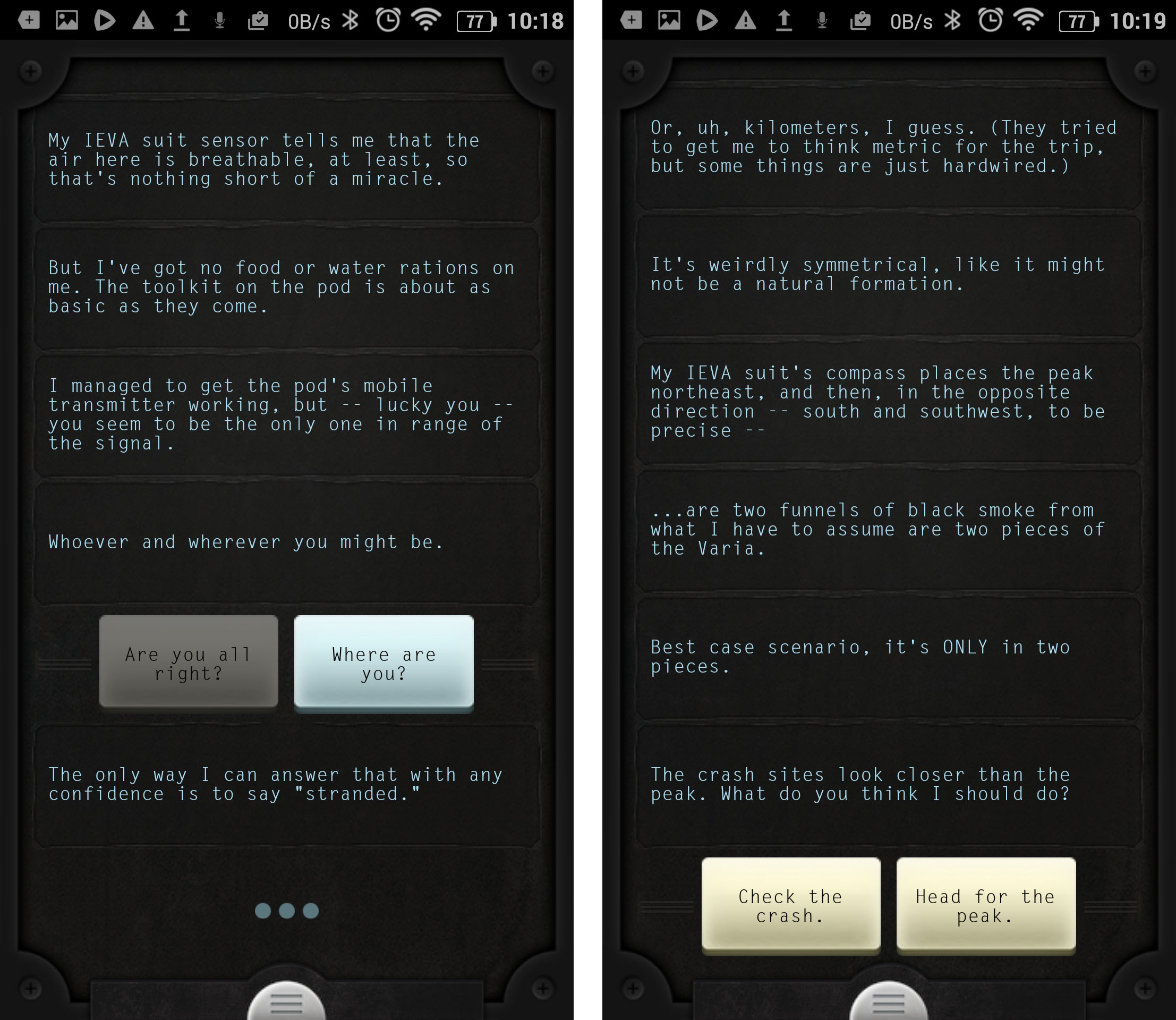 Ein auf einem fremden Planeten gestrandeter Astronaut findet ein Kommunikationsgerät, an dessen Ende – oh Wunder – dein Telefon hängt. Du hast in diesem Textadventure die unangenehme Aufgabe, ihn zurück auf die Erde zu bringen. (1,07 Euro, mit mäßigen In-App-Käufe)