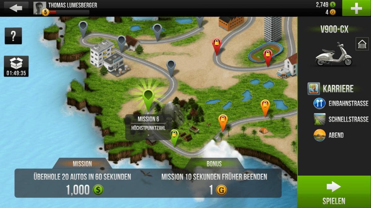 Gestartet wird mit einem kleinen Motorroller der gerade mal beim Bergabfahren die 100 km/h-Marke knackt. Mit Fortdauer des Spiels schaltest du immer neuere, bessere und natürlich auch schnellere Motorräder frei. Die musst du im Laufe der Zeit betreffend Leistung, Handling und Bremsen aufmotzen, was für Ingame-Währung möglich ist. Entsprechend verbessern sich natürlich die Fahreigenschaften deines Bikes.