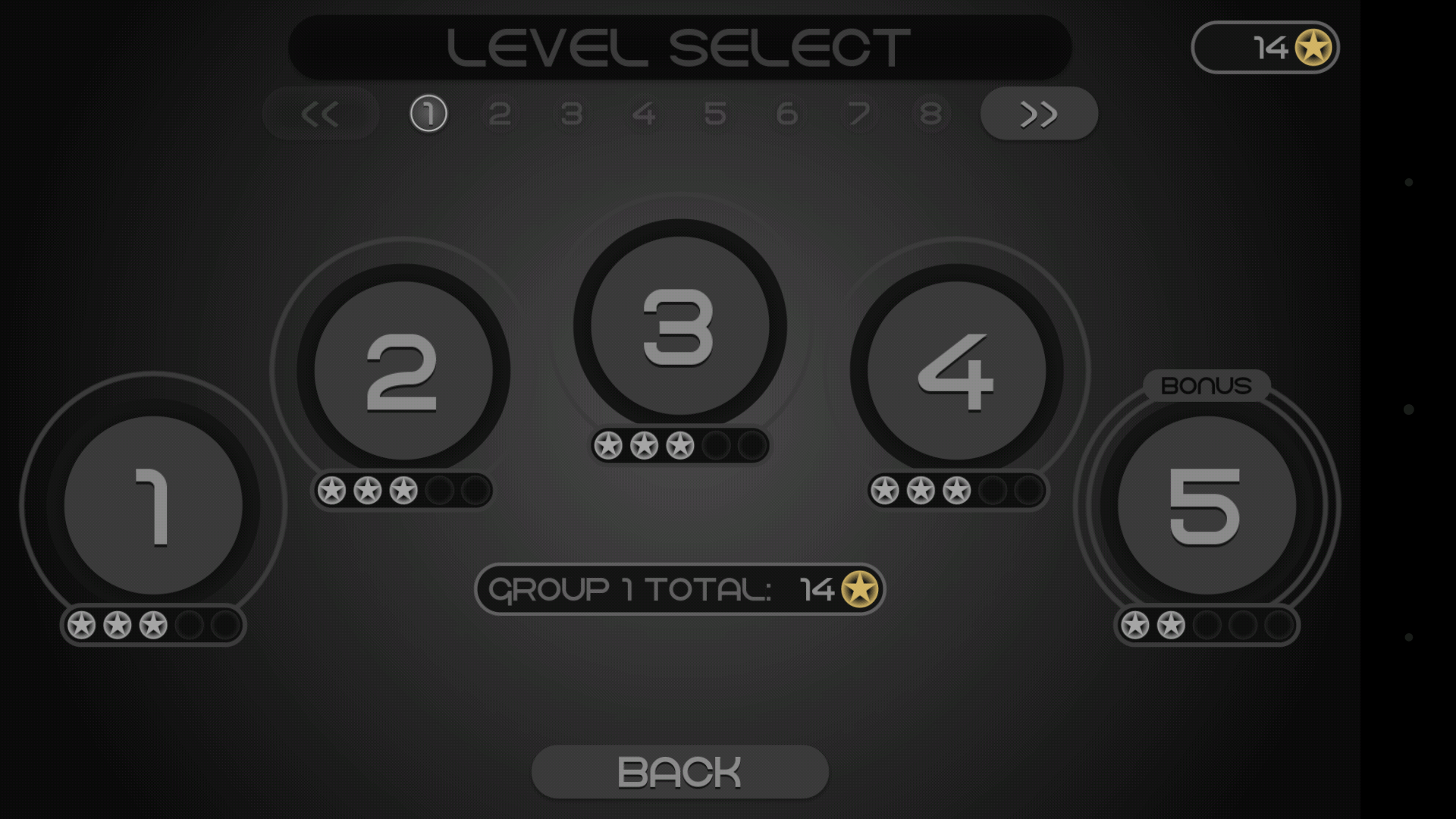 Insgesamt gibt es 40 Levels, die in Fünfer-Gruppen unterteilt sind. Zunächst ist nur die erste Gruppe zugänglich. Um weitere freizuschalten, musst du eine bestimmte Anzahl an Sternen erreichen. Und wer hätte das gedacht: Je schneller du einen Level absolvierst, desto mehr Sterne bekommst du.