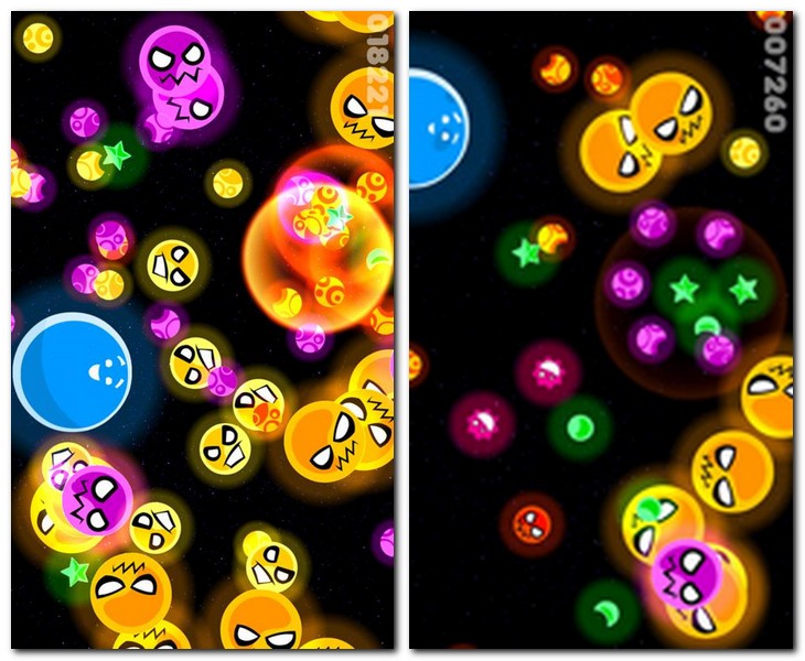 Aber zurück zum Thema und damit zu unserer süßen blauen Kugel, die eine Reise durchs All begeht und dabei ständig von seltsamen andersfarbigen Kugeln angegriffen wird, die allesamt wie die Smileys aussehen, die schon lange nichts mehr zu lachen gehabt haben. Berühren euch zuviele dieser umherschwebenden Miesepeter, müsst ihr die Runde nochmal von vorn beginnen.