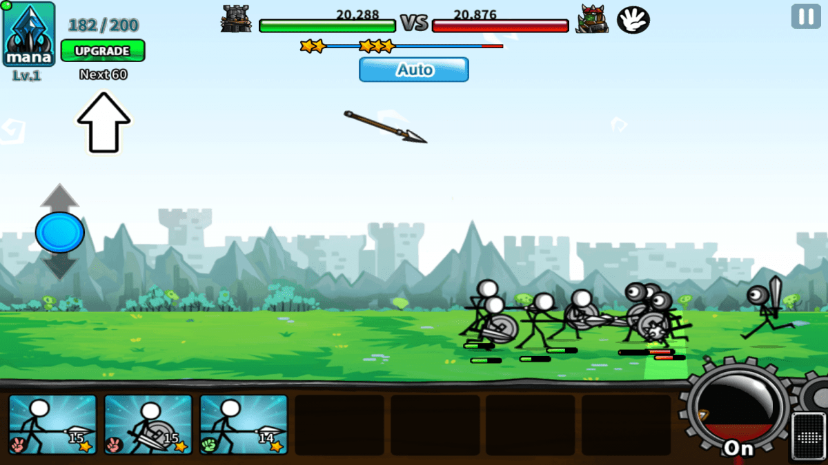 Deine Aufgabe ist es, mit Hilfe deines Turms, dem Bordgeschütz sowie den Bodeneinheiten, die gegnerischen Soldaten auszuschalten und deren Basis zu zerstören. Dabei ist die Steuerung recht simpel. Auf der linken Seite des Bildschirms findest du einen Steuerknüppel, den du nach oben oder unten schieben kannst. Damit veränderst du die Position des Bordgeschützes. Mit einem Tipp auf den Feuer-Button rechts unten feuert das Geschütz kontinuierlich Speere auf die herannahenden Einheiten ab. Mit einem weiteren Tipp darauf wird das Dauerfeuer eingestellt. Das ist auch hin und wieder nötig, denn die Munition ist begrenzt. Der Vorrat wird erst wieder aufgeladen, wenn nicht gefeuert wird.