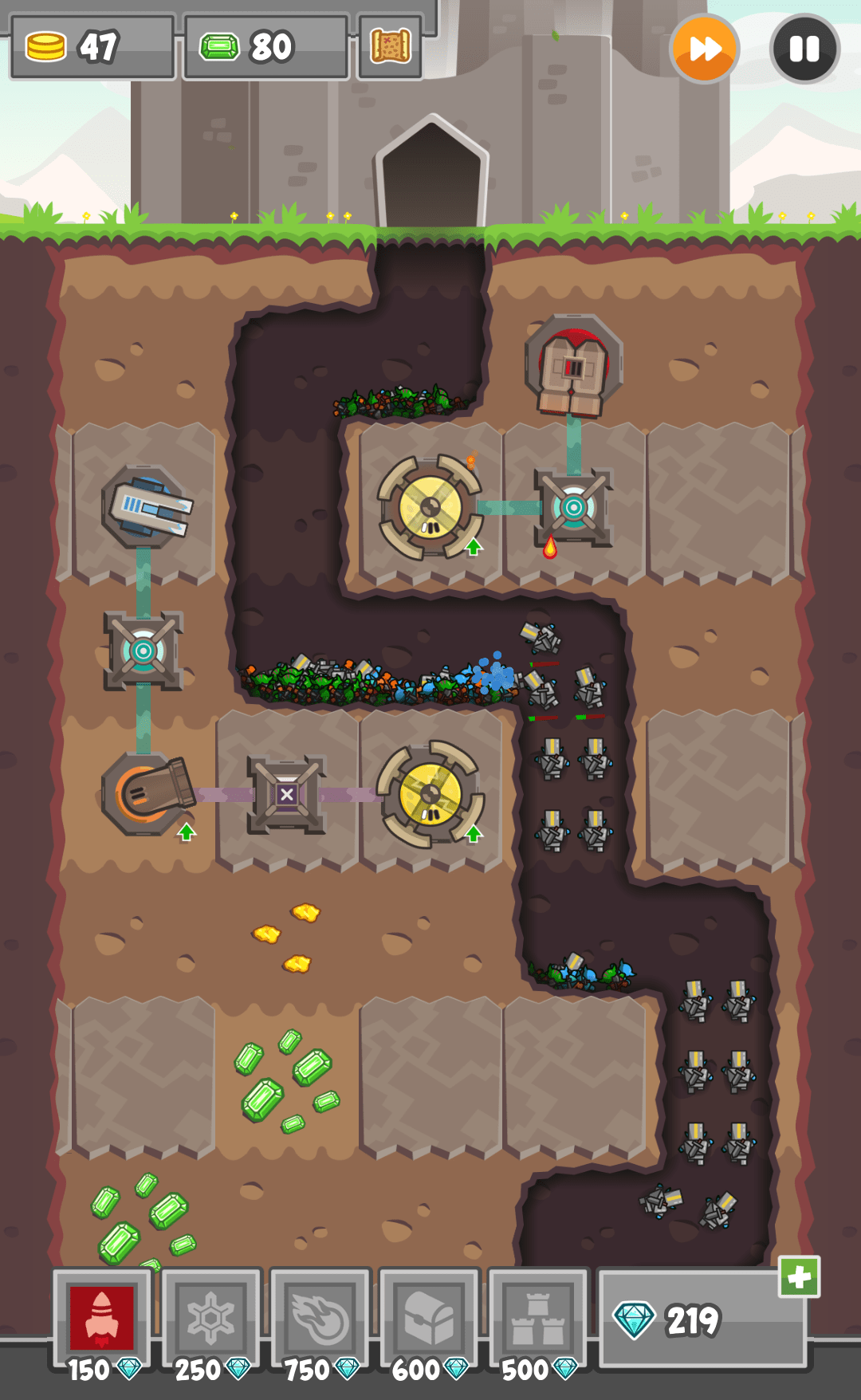 Natürlich gibt es auch bei Digfender Upgrades und Verbesserungen. Doch diese App enthält nur zum Teil vorgegebene Levels. Du musst also die Anlagen nicht entlang eines fixen Pfads aufstellen, du kannst den Pfad selbst bestimmen.