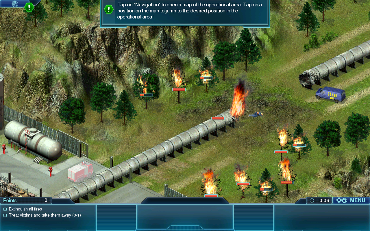 Im Hintergrund sorgen Gefahren wie verbrennende Gaskanister für zusätzliche Action. Feuer ist für Notfallmediziner höchst unangenehm – es ist deshalb mehr als ratsam, zuerst die Jungs in Orange zur Brandbekämpfung abzustellen. Aus technischer Sicht gibt es an Emergency nichts auszusetzen. Der Titel ist sauber implementiert, die Grafik ist für ein Strategiespiel ausreichend – leider wirkt sie auf hoch auflösenden Bildschirmen etwas verwaschen. Die Steuerung ist indes primitiv und schnell erlernbar, ein in die erste Mission integriertes Tutorial erklärt die Grundlagen zwecks besserem Verständnis.